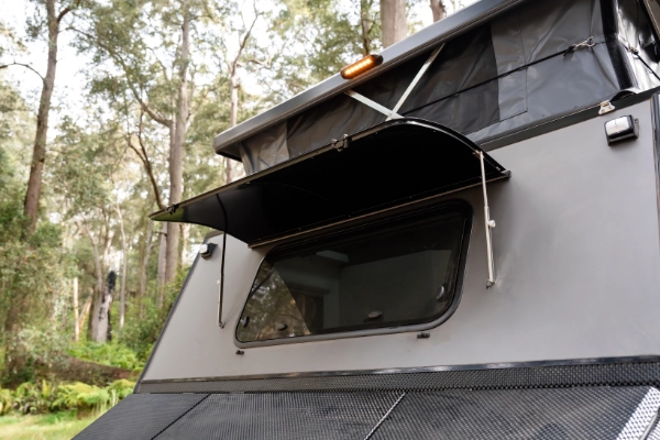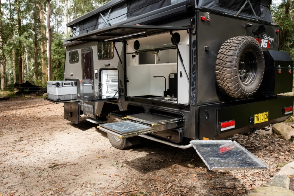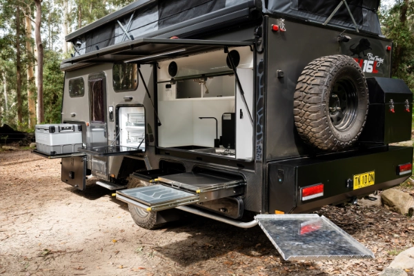 - Electrically operated pop-top roof, Awnlux electric awning complete with walls, floor and side skirt, and always ready outdoor kitchen.