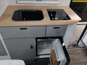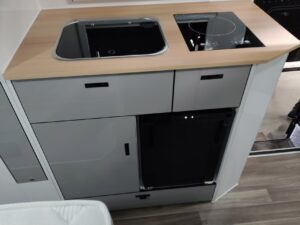 - Internal kitchenette with sink, induction cooktop, and microwave